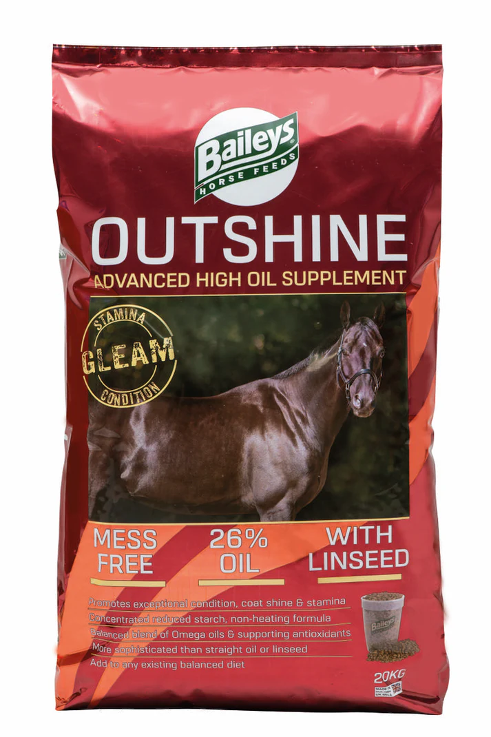 Outshine is an extruded nugget that combines oils from soya and linseed with supporting nutrients, including important antioxidants, plus superfibres and Digest Plus prebiotic, to produce a high oil supplement which can be fed to promote weight gain or stamina or simply outstanding coat shine. Soya oil is rich in Omega 6 fatty acids, whilst linseed is an excellent source of Omega 3 so Baileys Outshine combines them both to give an optimum balance, avoiding the risk of an imbalance from feeding straight soya oil or boiled linseed.