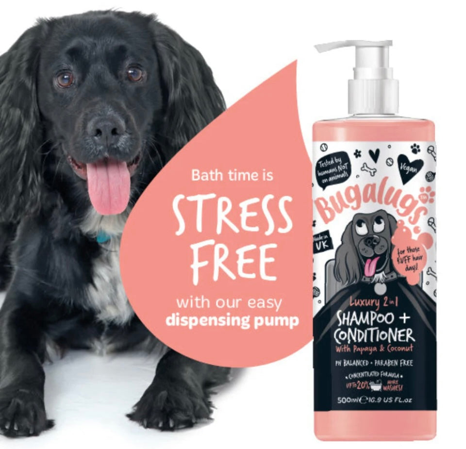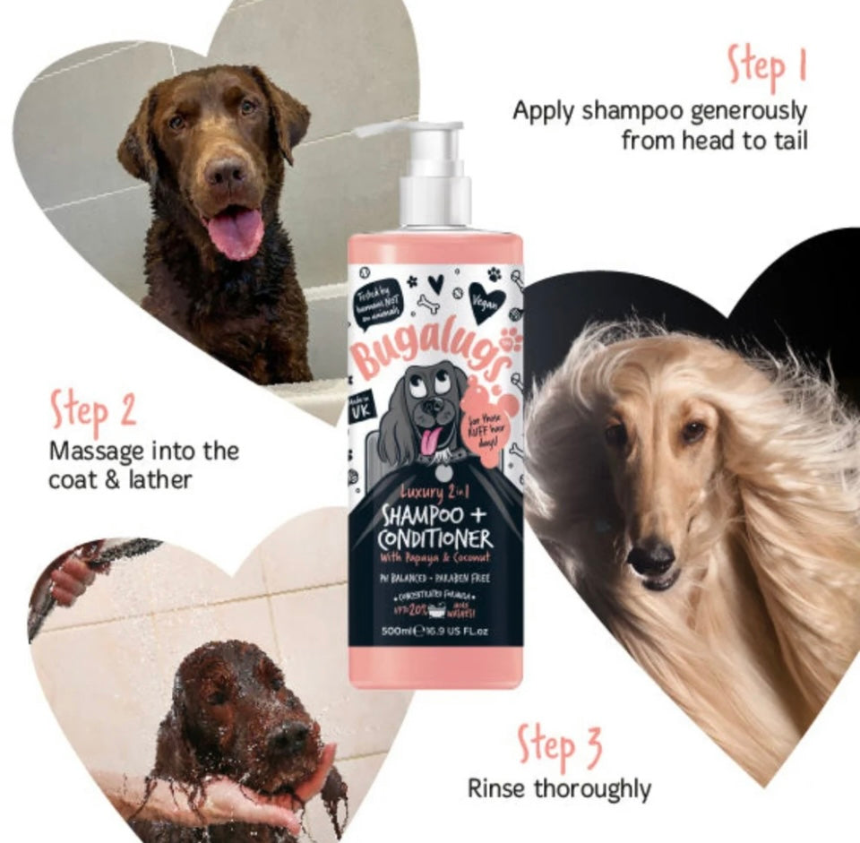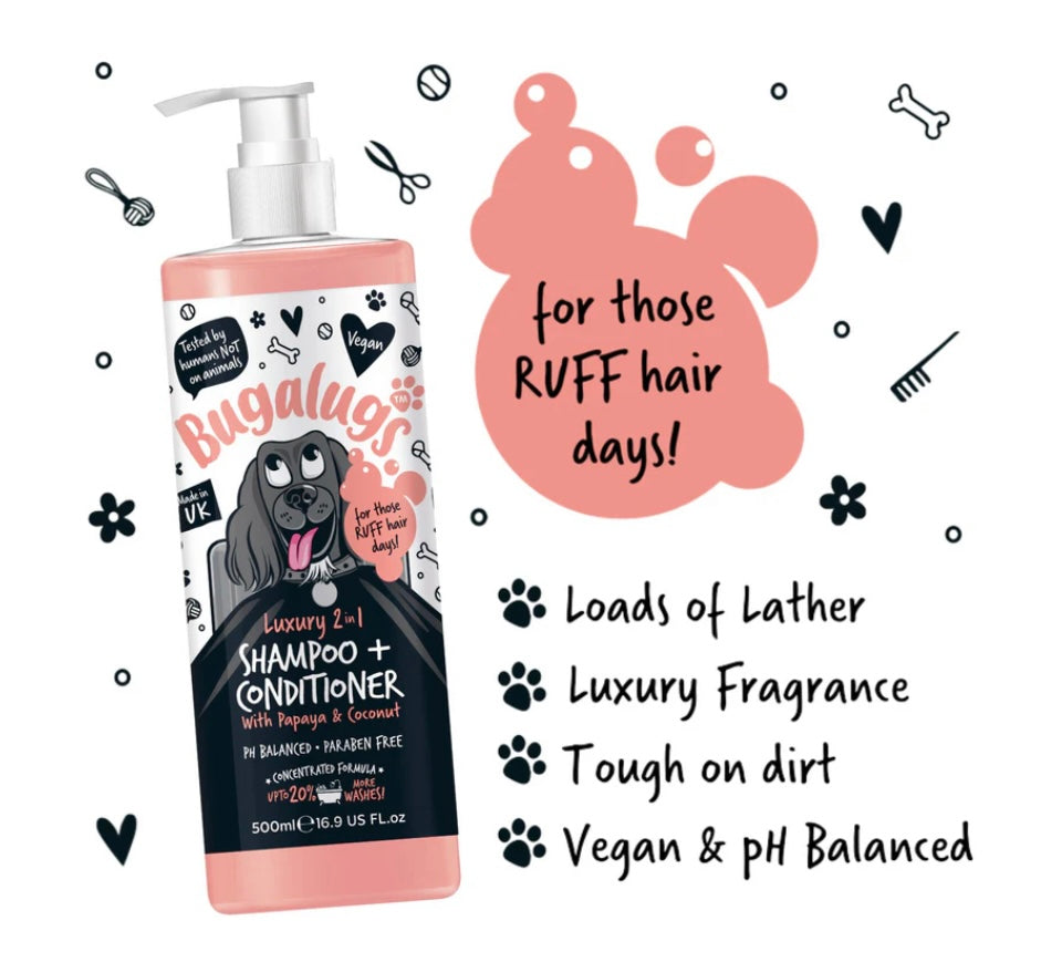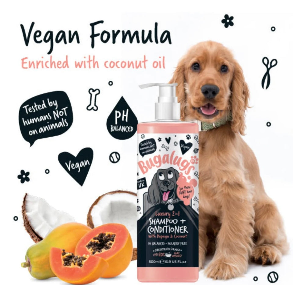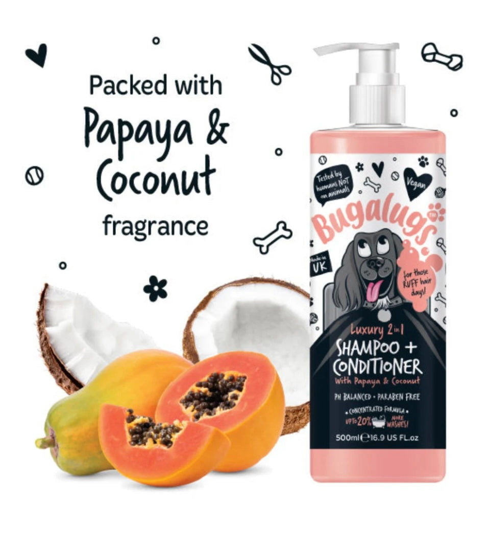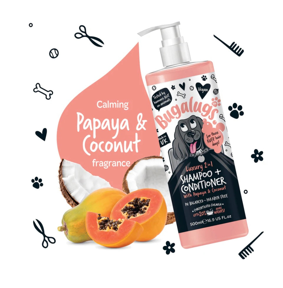 Bugalugs luxury 2 in 1 shampoo and conditioner is packed with papaya and coconut to indulge your dog in a luxurious lather, with a long lasting tropical fragrance.