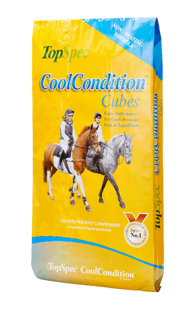 TopSpec CoolCondition Cubes are cereal-grain-free. They have a good conditioning index of 12.5MJ/kg as fed, yet are “Non-Heating” allowing horses to look good but focus on the job in hand.