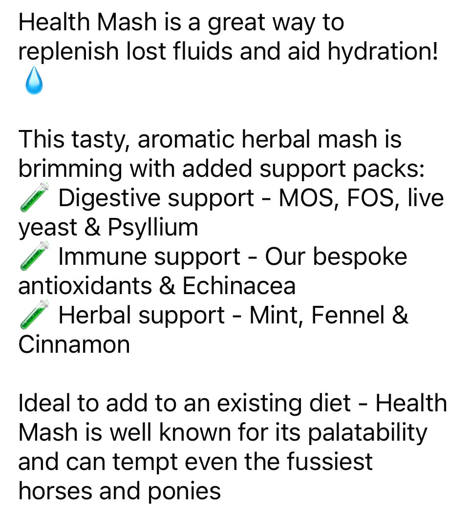 Health Mash is an extremely versatile feed , Non heating , means it is suitable to be fed to most horses & ponies , including those with sensitive digestion & as an added bonus it is ready to feed in just under ten minutes .