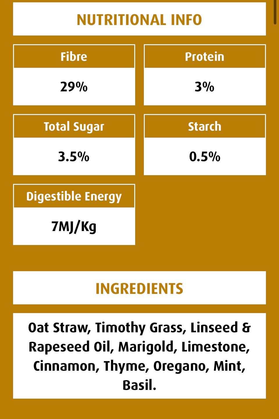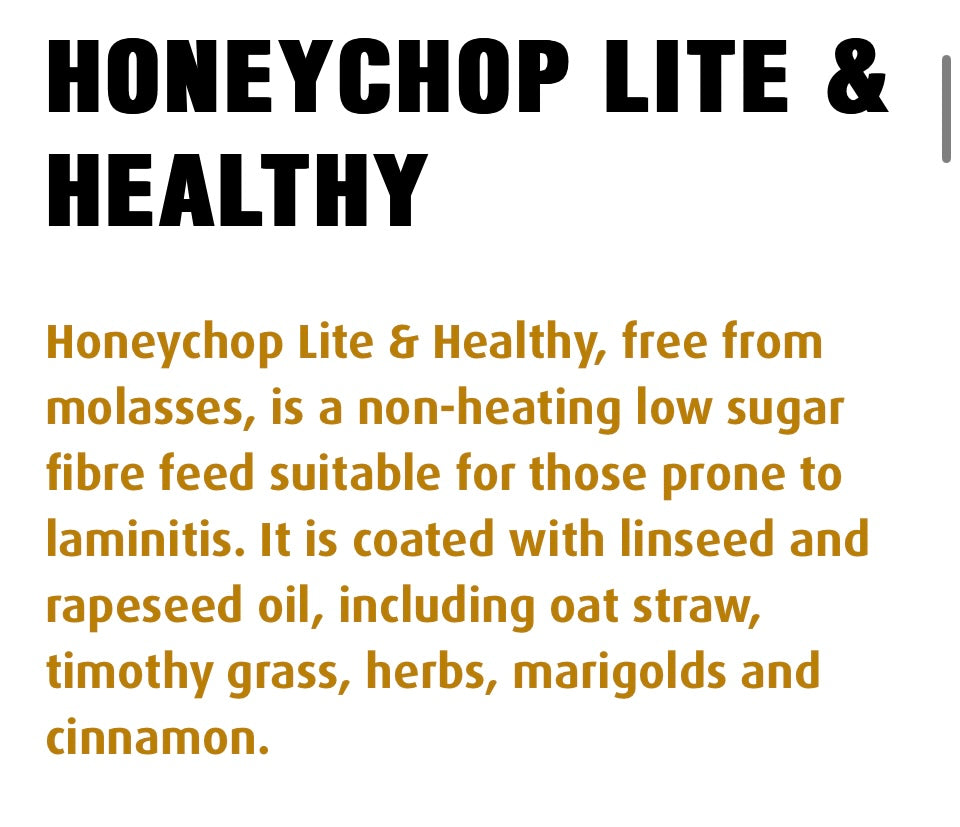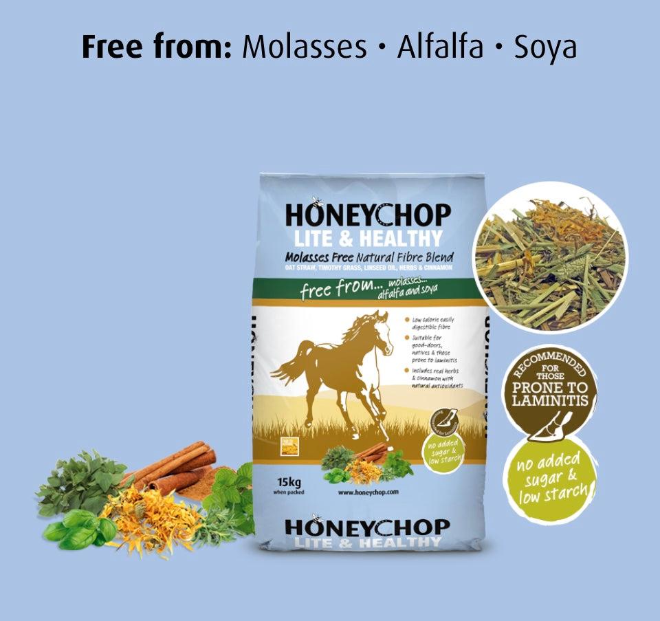 Horses are herbivores , evolved on a diet of grasses , the blend of natural fibres & selecte herbs in Honeychop Lite & Healthy will add natural variety to your horse , pony or donkey diets, mimicking the natural environment in which they should graze .