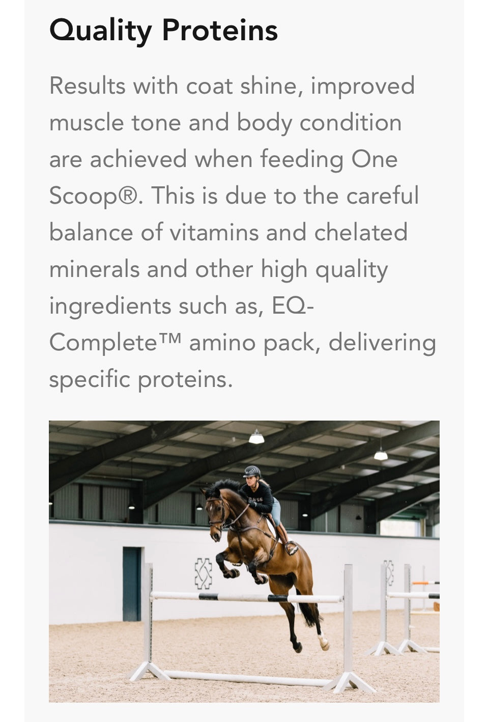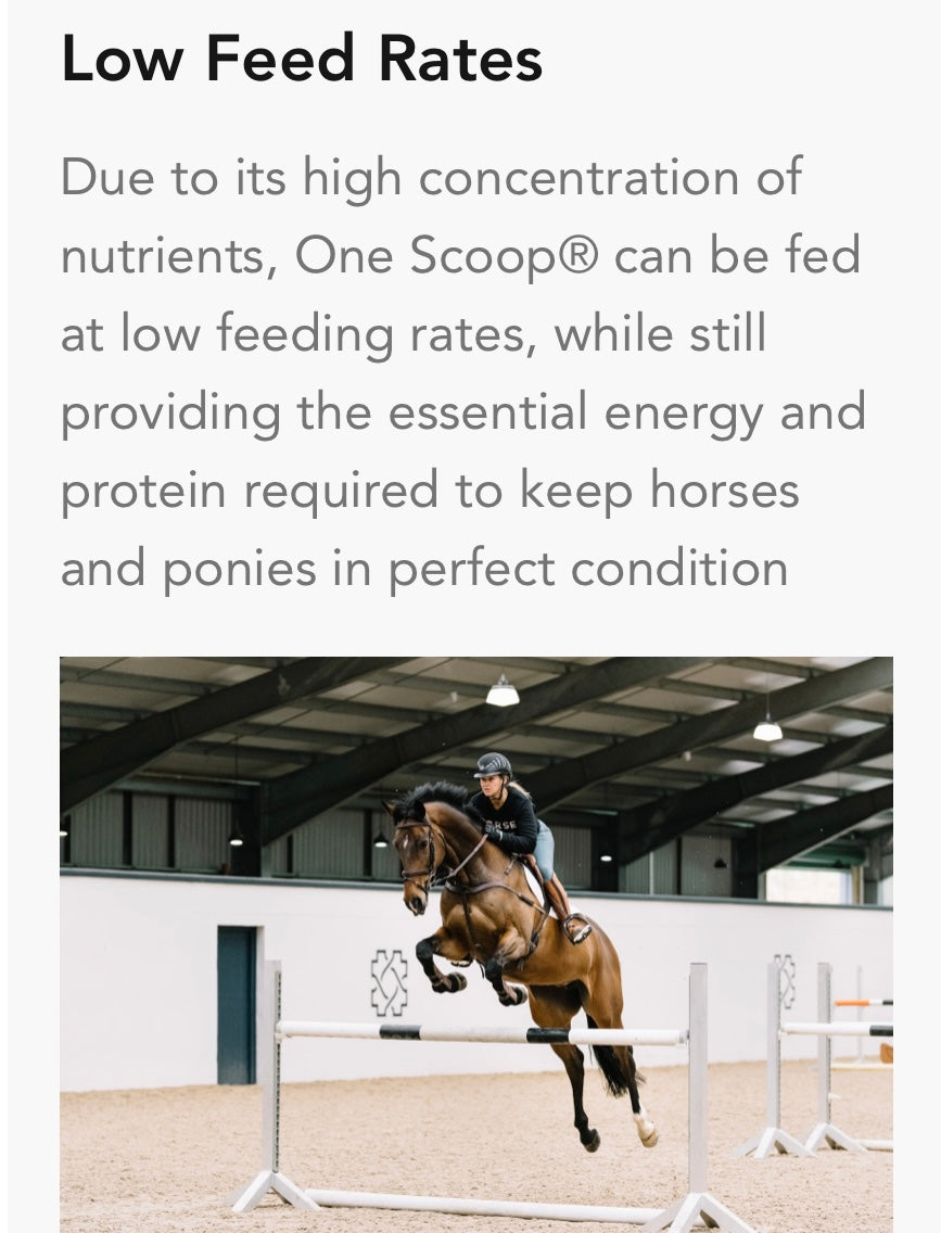 Due to its high concentration of nutrients, One Scoop® can be fed at low feeding rates, while still providing the essential energy and protein required to keep horses and ponies in perfect condition.
