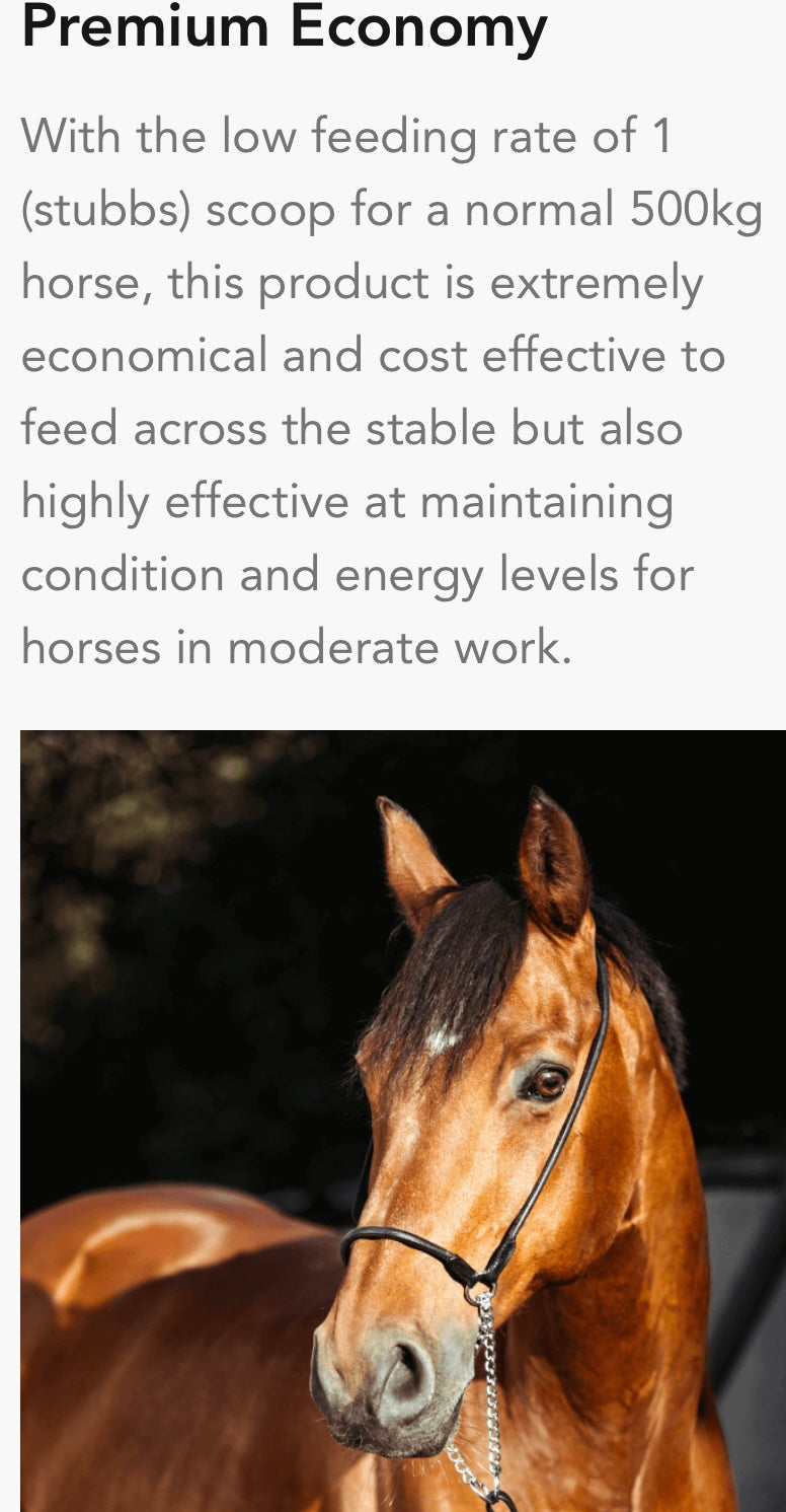 With the low feeding rate of 1 (stubbs) scoop for a normal 500kg horse, this product is extremely economical and cost effective to feed across the stable but also highly effective at maintaining condition and energy levels for horses in moderate work.