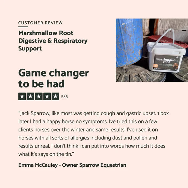 Boost your horse’s health with Marshmallow Root, our little miracle supplement known for its rich mucilage content. This soothing gel-like substance coats and calms both the digestive and respiratory systems, helping to ease gastrointestinal discomfort and provide relief from respiratory issues and allergic reactions.